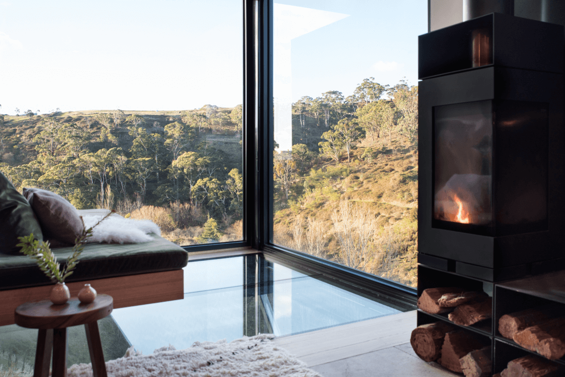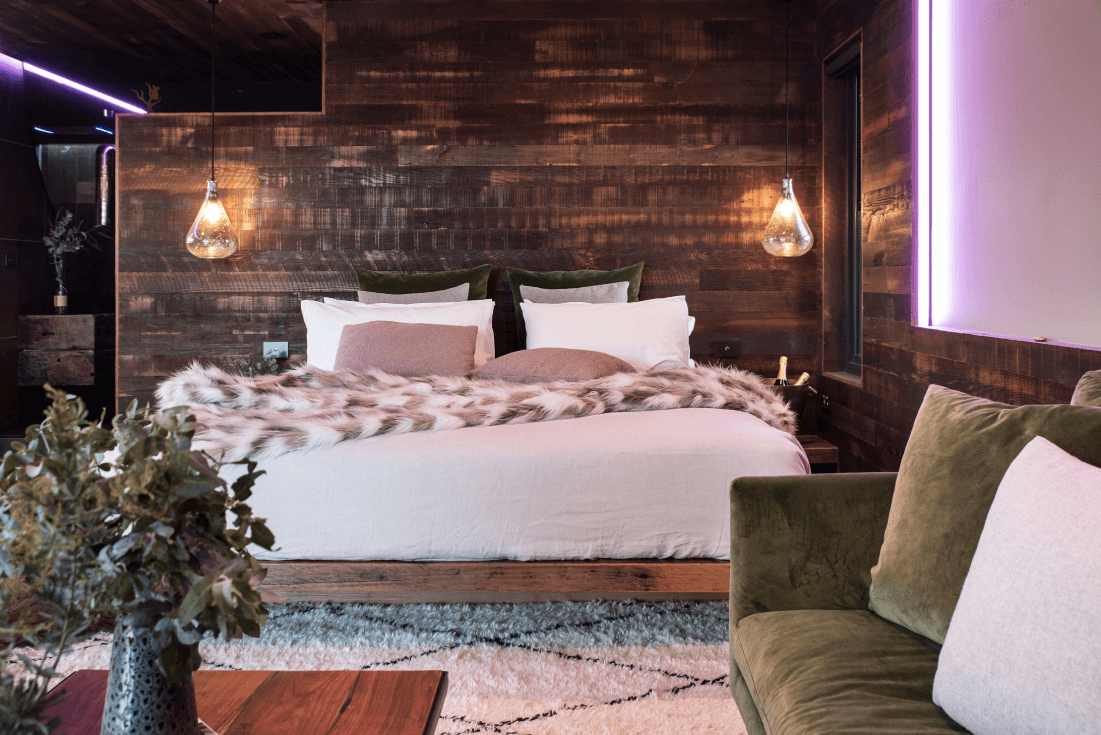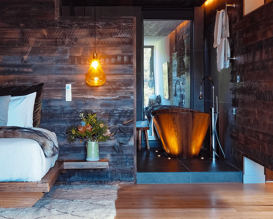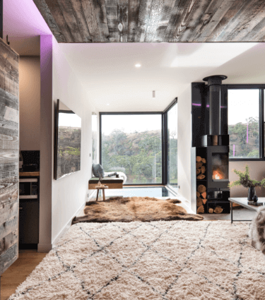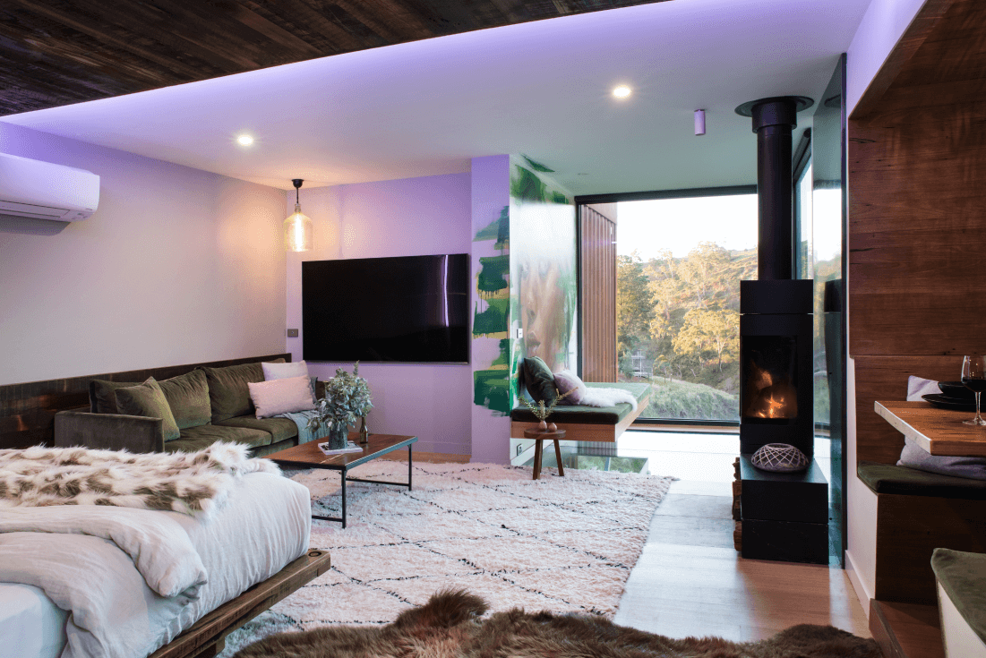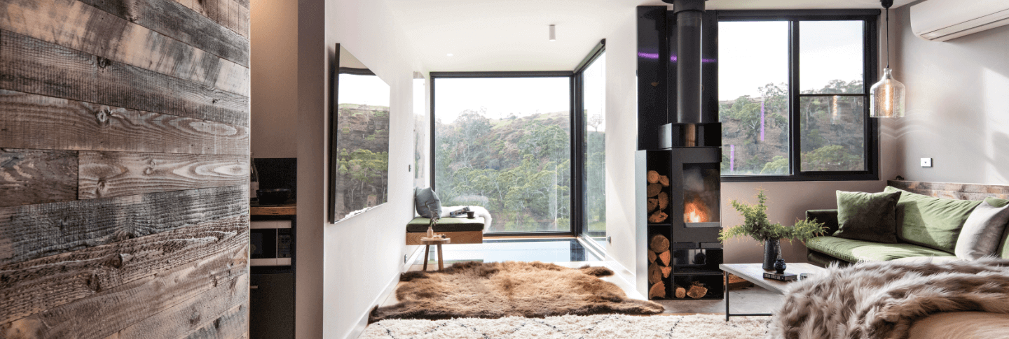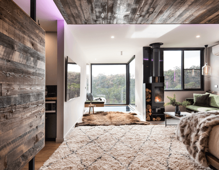 We’ve left nothing out, from the picturesque setting to the huge HD television, Bison rugs, velvet sofas, iPads with Spotify, award-winning Oblica fireplace, Tasmanian blackwood baths and hand-crafted floating bed! Every tile, every plank of reclaimed wood, every rustic feature wall…everything has been handpicked to indulge the senses.